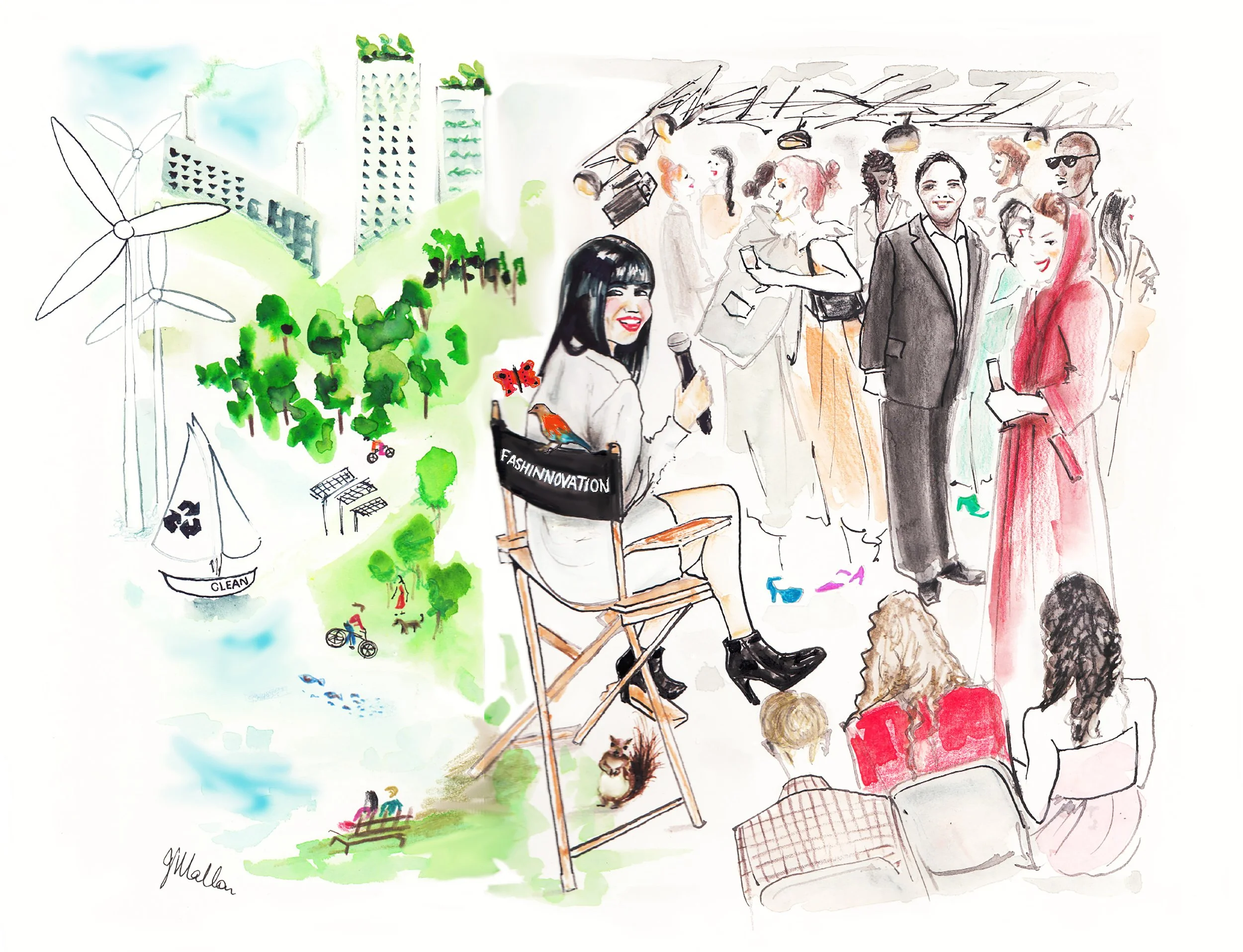 In celebration of Jordana who co-founded Fashinnovation with her husband Marcelo, illustrated in the suit, whose sustainability-focused industry platform strives to bridge the gap between industry and a better world.