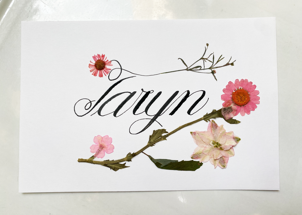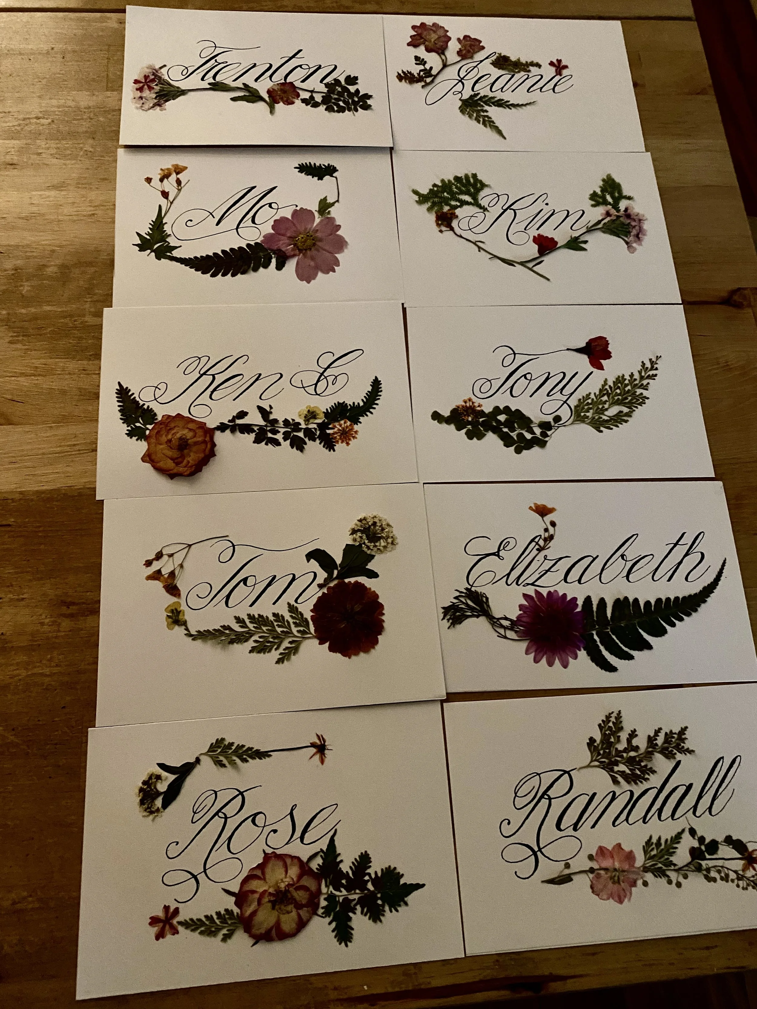 Combining pen and ink hand calligraphy with pressed flower embellishment to create the most unique name cards