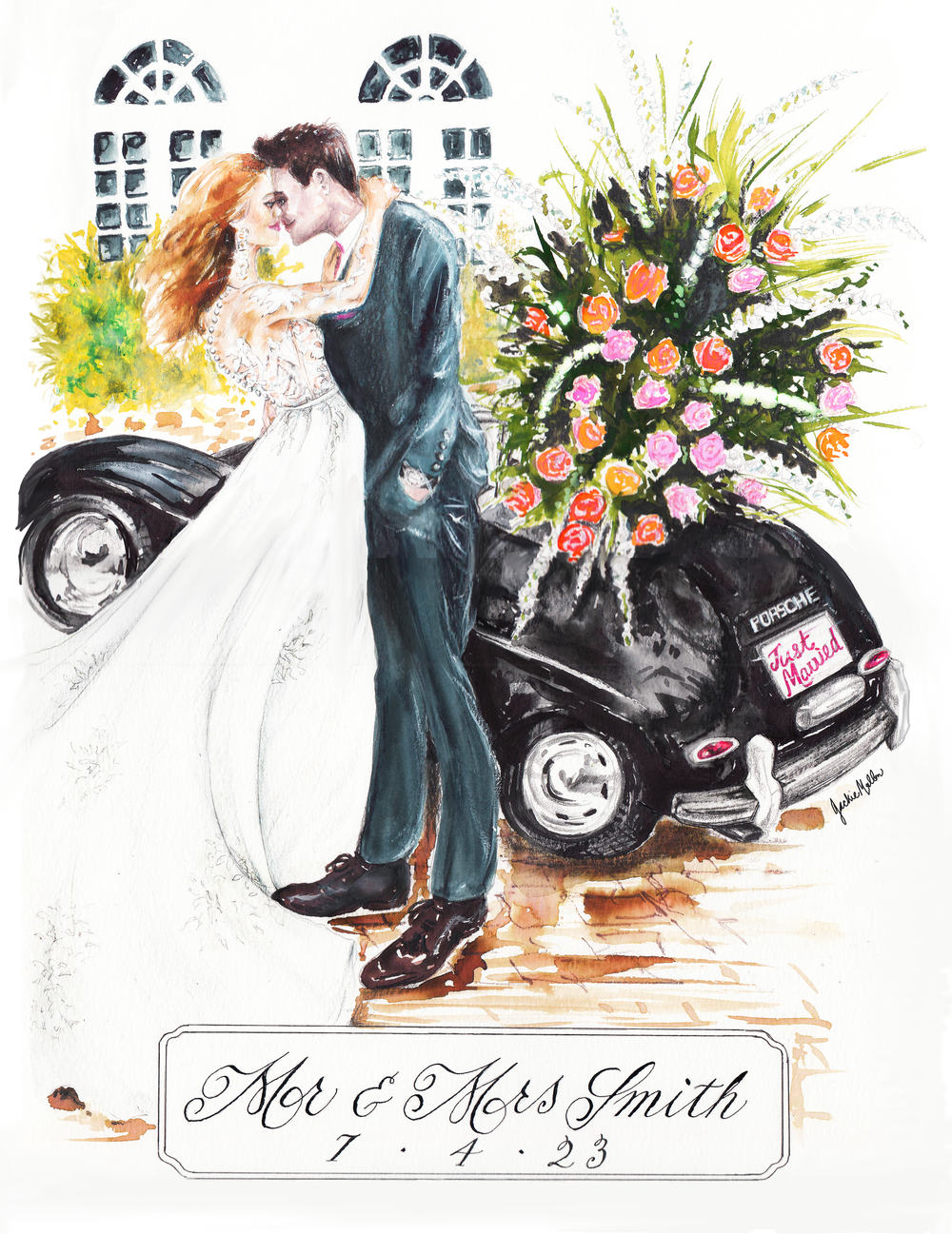 Bride and groom outside the venue ready to hop into their honeymoon getaway mobile plus calligraphy inscription commemorating the date