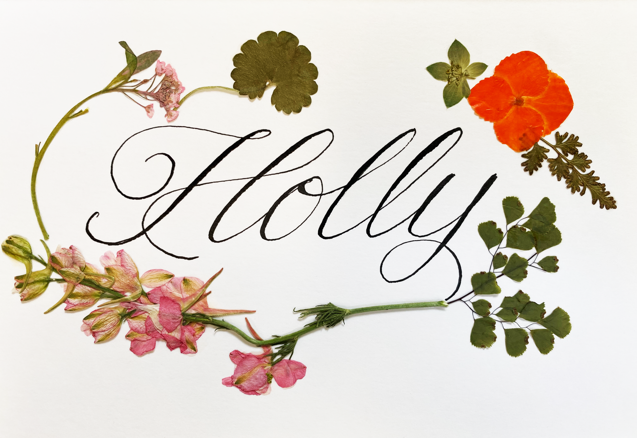 A combination of pen and ink calligraphy and pressed flowers for an exquisite placename